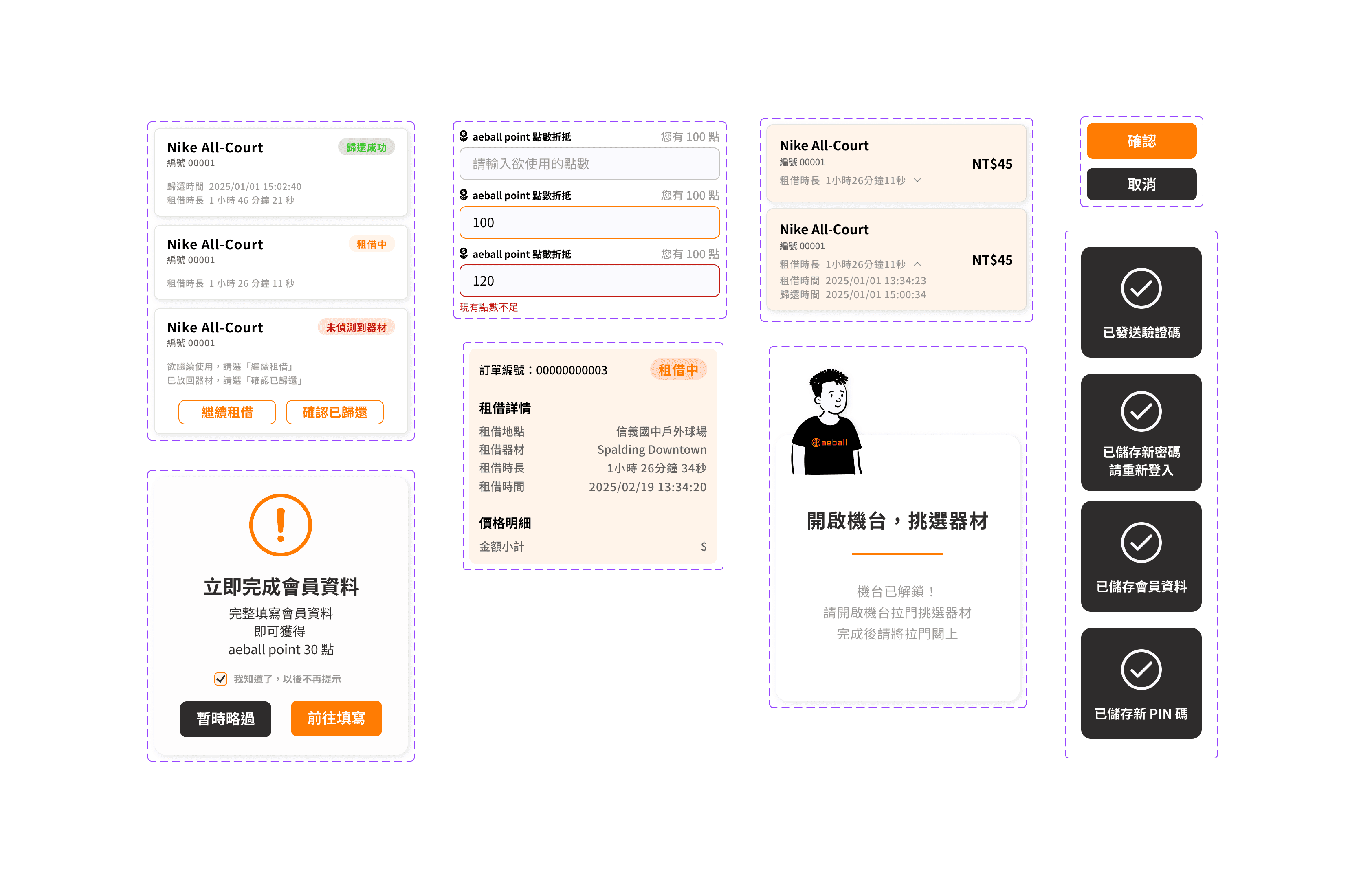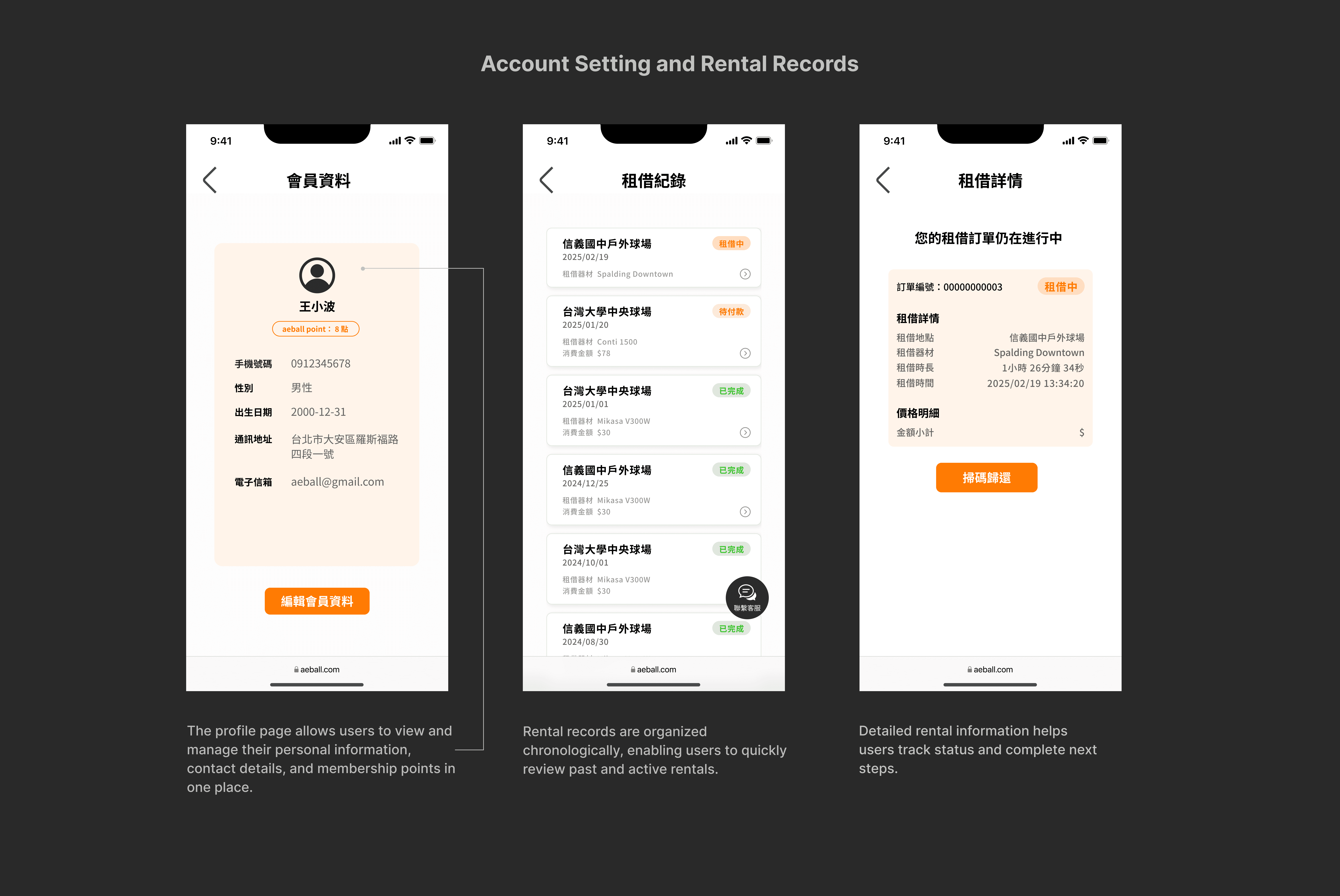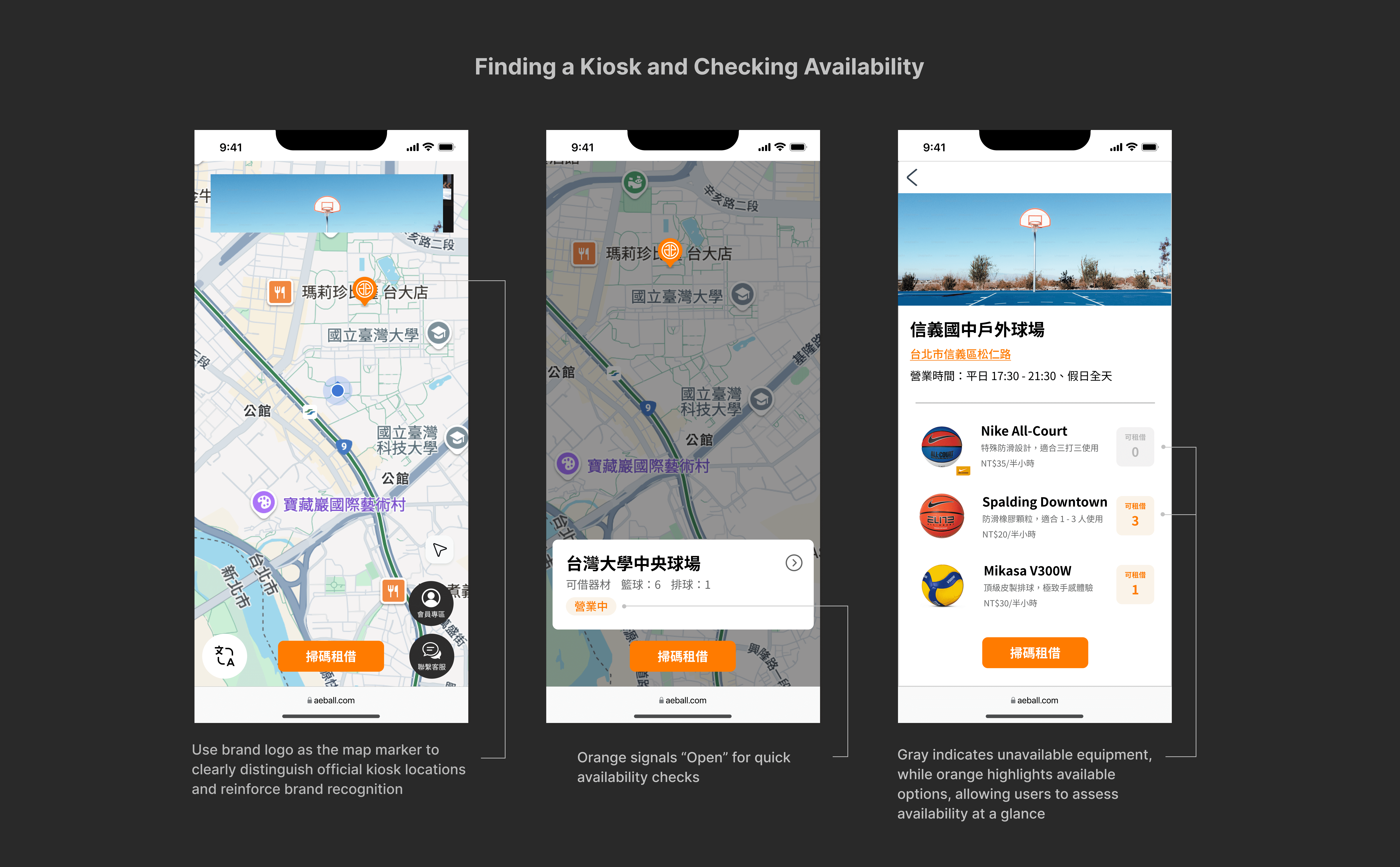 Designed intuitive and clear interfaces for the Aeball Web App, guiding users through the entire ball rental journey - from finding kiosks and borrowing, to returning and payment. The experience spans mobile and physical kiosks: users complete the rental flow on mobile, while picking up and returning balls at on-site kiosks. Therefore, my design focuses on clearly communicating kiosk status to ensure seamless and understandable interactions for users.