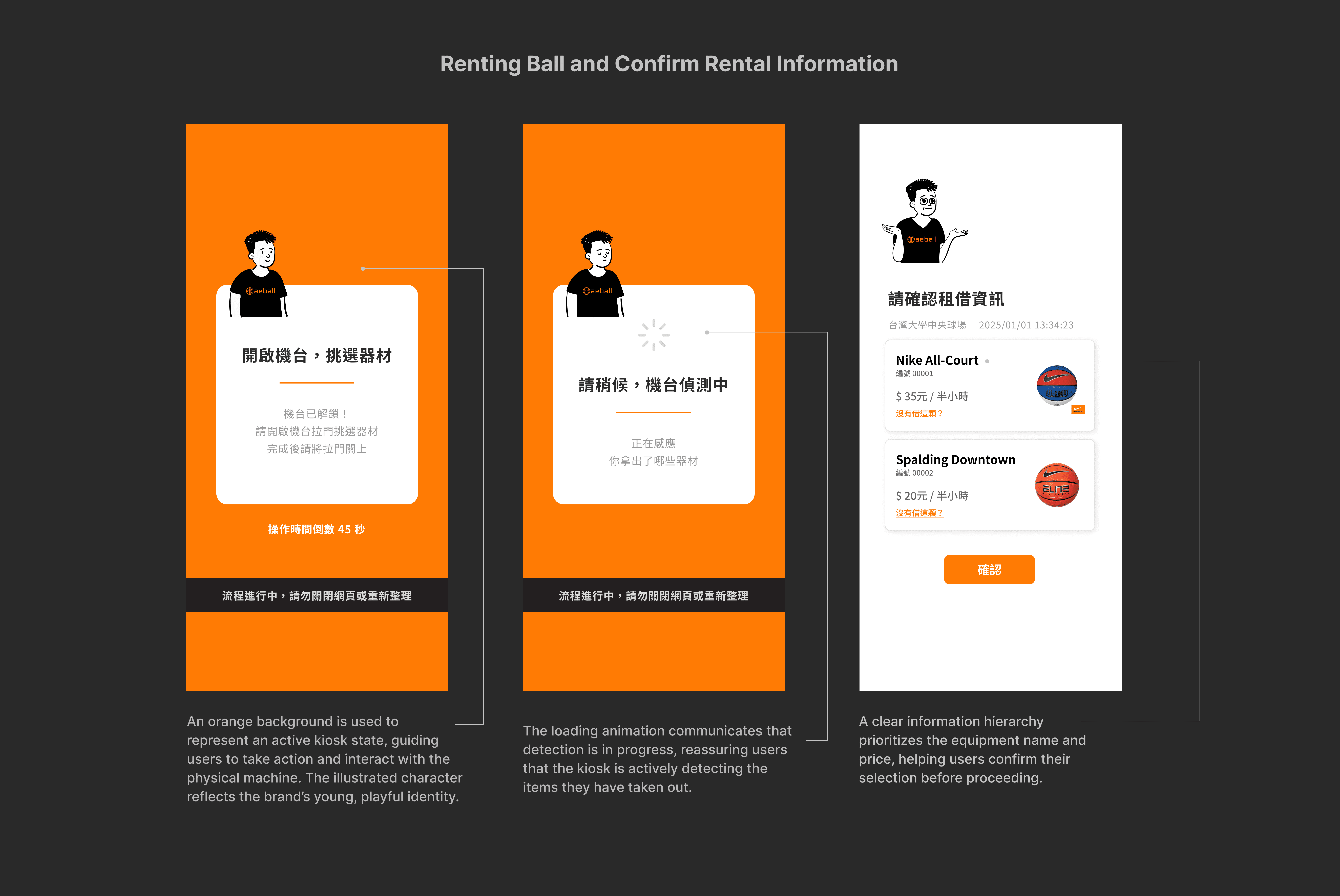 Renting and returning balls require interaction with the physical kiosk. I thought clearly communicating the kiosk’s current status was crucial to help users feel confident and understand what is happening at each step.